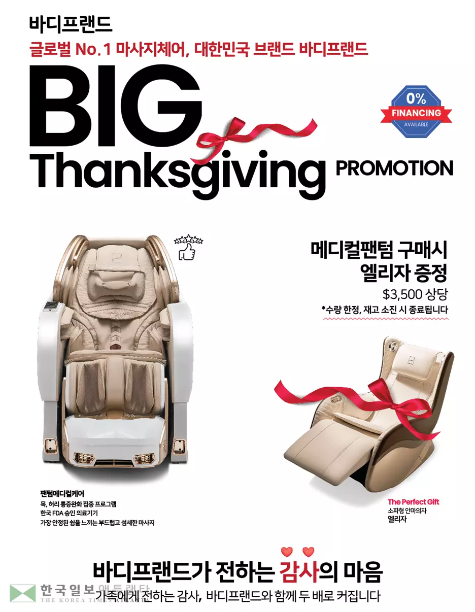 바디프랜드 관계자는 “추수감사절을 맞아 가족에게 전하는 감사의 마음을 더 크게 나눌 수 있도록 특별 프로모션을 준비했다”며 “바디프랜드의 헬스케어 로봇 기술을 직접 체험하고 건강한 휴식을 경험하길 바란다”고 밝혔다.