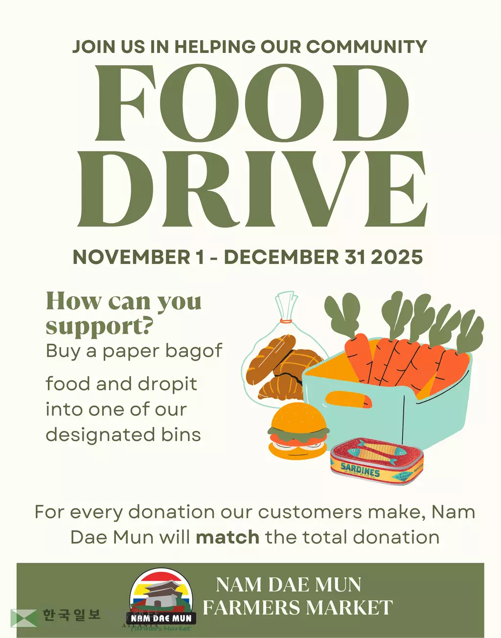 남대문마켓이 이웃을 돕는 지역사회 푸드 드라이브에 참여해 달라고 지역사회에 호소하고 나섰다.