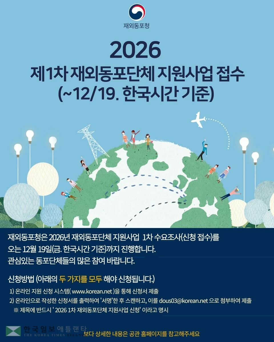 재외동포청은 2026년도 재외동포단체 지원사업 수요조사를 12월 19일까지 실시한다.