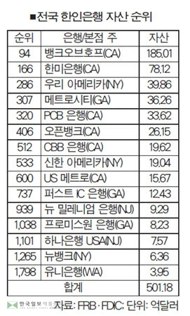 미국에서 영업하는 15개 한인은행 중 뱅크오브호프가 전국 은행 순위에서 100대 은행에, 한미은행은 200대 은행에 각각 랭크됐다. 또 한인은행들의 총 자산규모가 사상 처음 500억달러를 돌파했다.