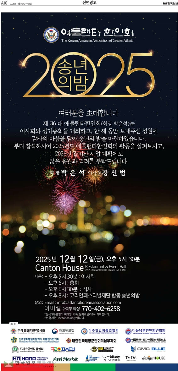 한인회와 코페재단 합동 송년회가 12일(금) 둘루스 캔톤하우스에서 열린다. 오후 5시 30분 이사회, 6시 총회, 6시 30분 식사, 오후 8시 합동송년회 순으로 열리며, 초청 인사에 한하여 참석할 수 있다. 문의=770-402-6258.