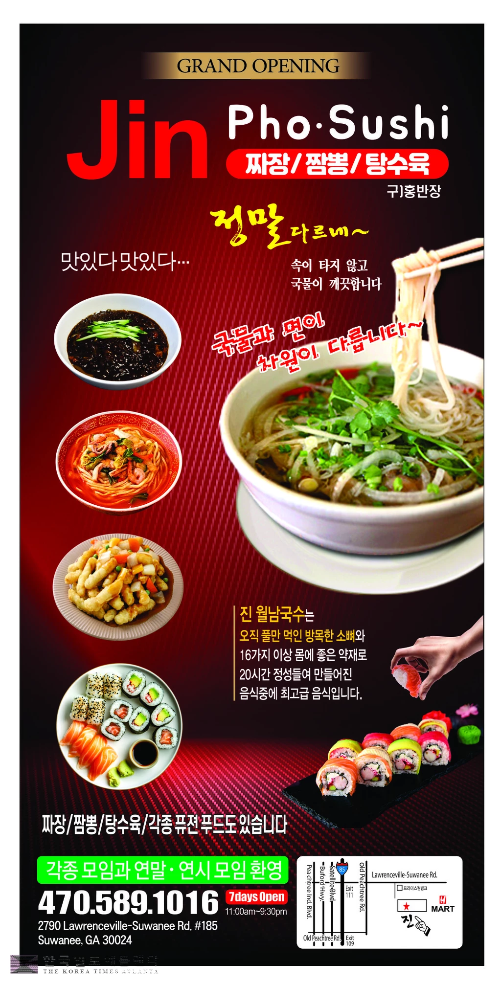 월남국수와 스시, 짜장 쩜뽕 탕수육을 전문으로 하는 진포스시가 스와니 구)홍반장 자리에 오픈했다.국물과 면이 차원이 다르며, 몸에 좋은 약재로 20시간 이상 정성들여 만든 월남국수를 자랑한다. 주소=2790 Lawrenceville-Suwanee Rd, #185, Suwanee. 전화=470-589-1016.
