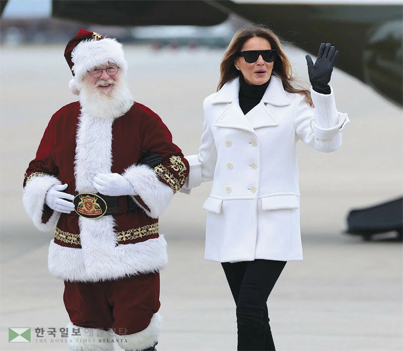 도널드 트럼프 대통령 부인 멜라니아 여사가 지난 8일 버지니아주에서 열린 미 해병대의 연말 어린이 장난감 나눠주기 행사에 참석하기 위해 전용 헬기에서 내려 산타 복장 요원의 에스코트를 받으며 손을 들어 인사하고 있다. [로이터]