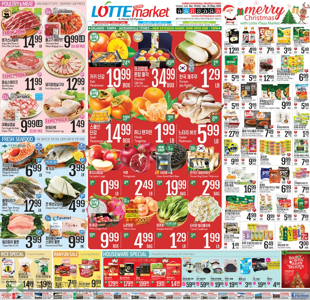 정육 코너에서는 앵거스 LA갈비 패밀리팩 LB 14.99, 양념 소등심 불고기(매운맛) LB/9.99, PK/14.99, 등심 스테이크 패밀리팩 LB 11.99, 돼지항정살구이 LB 12.99, 대패삼겹살 LB/9.99, PK/11.99, 닭쿼터랙 패밀리팩 LB 1.49에 공급된다.