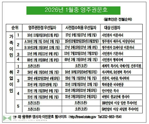 사전접수 허용 우선일자 역시 영주 권자의 배우자와 미성년자 자녀가 대 상인 2A 순위가 2025년 12월22일로 전월 대비 1개월 개선되고 영주권자의 성년 미혼 자녀가 대상인 2B 순위가 2017년 3월15일로 1주일 진전됐을 뿐 모두 동결됐다.