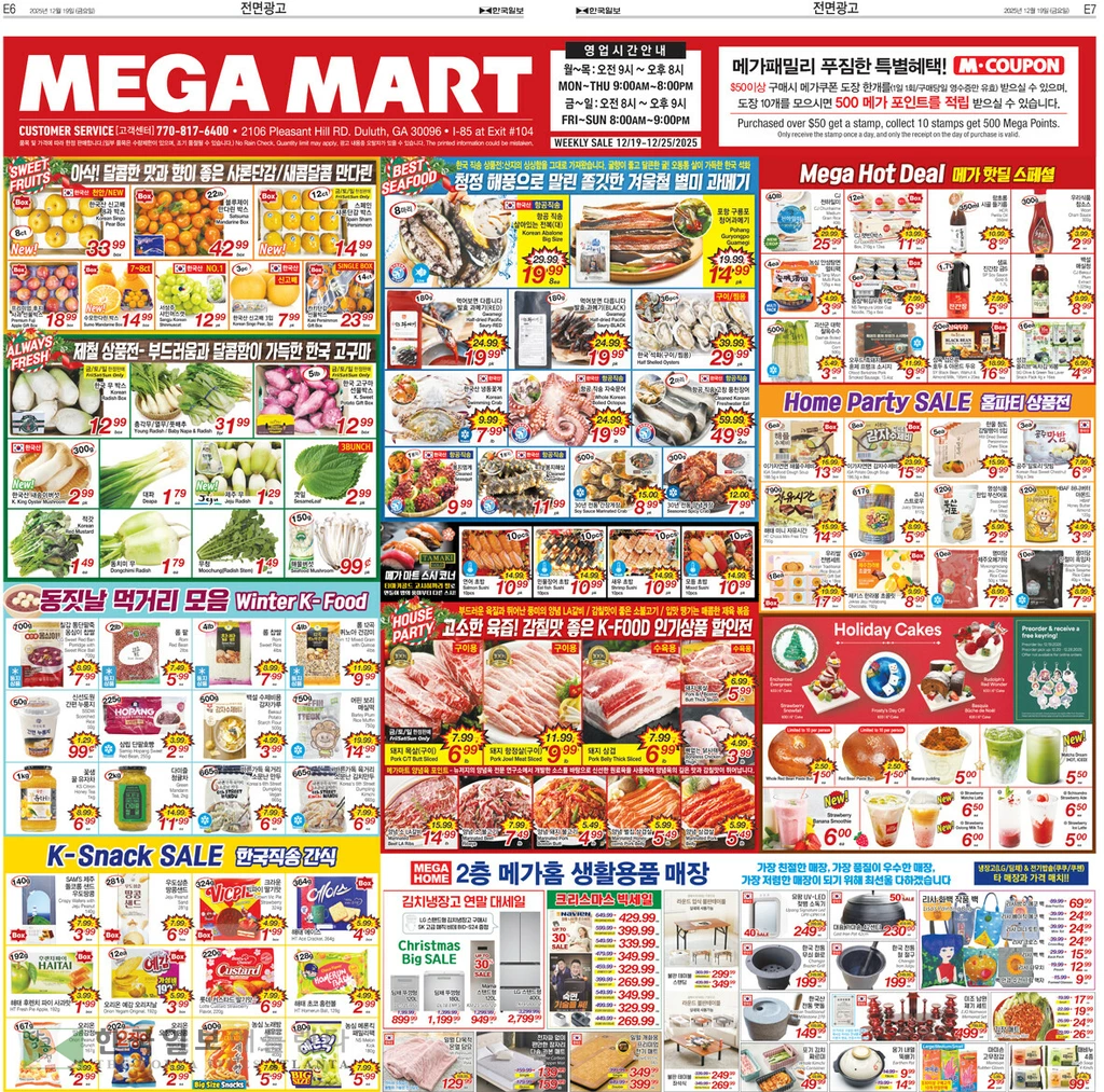 메가 HOT DEAL로는 CJ 천하일미40lb ea 25.99,CJ 햇반 박스 ea $11.99,함초롬 시골 들기름 ea $8.99우리 식품 참소스 ea 2.99,농심 안성탕면 멀티팩 3.99,농심 튀김우동 6컵 6.99,샘표 진간장금 5.99등이 선보인다.