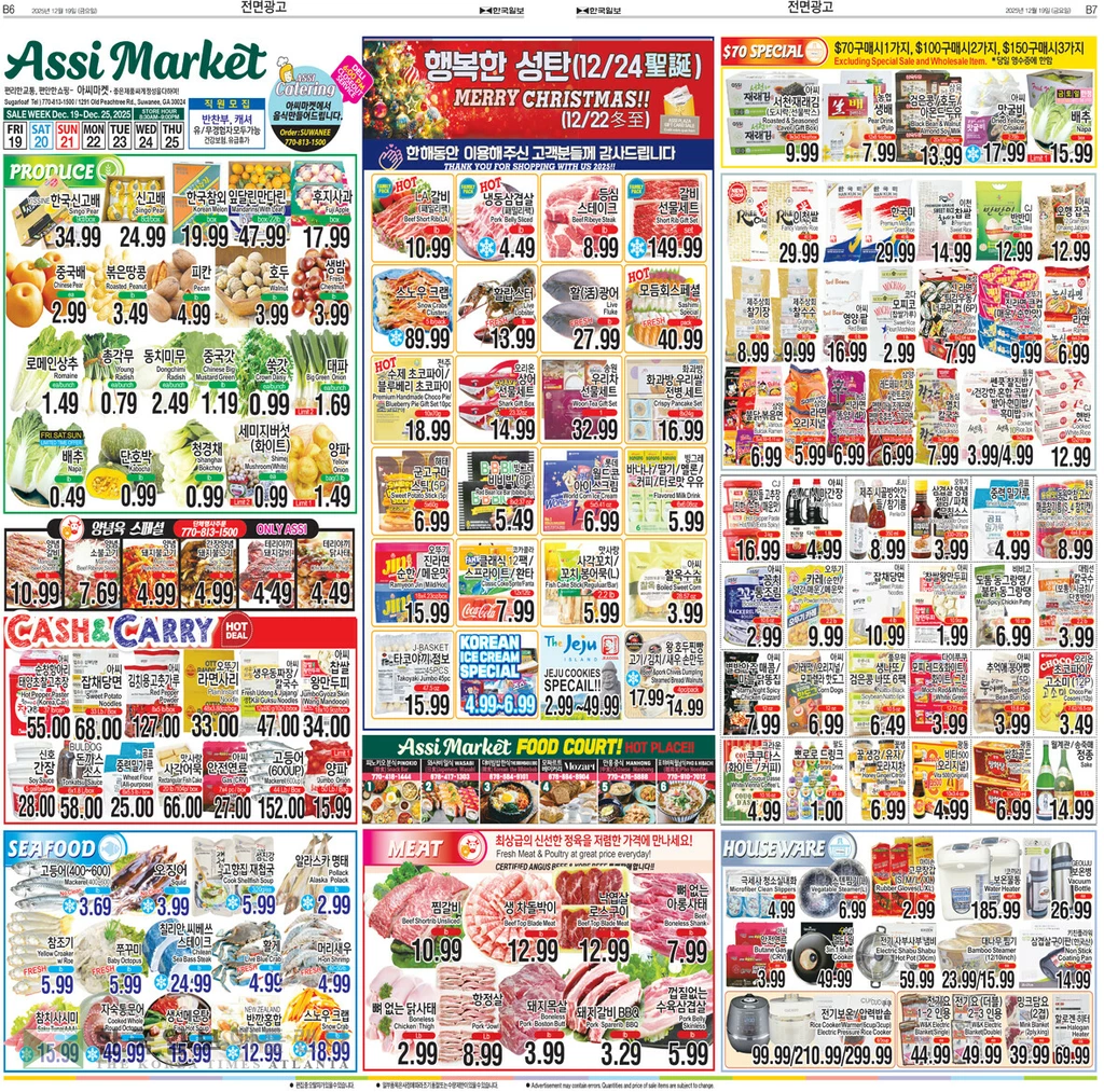 생선 코너에서는 고등어(400~600) LB 3.69, 오징어LB 3.99, 참조기LB 4.99, 알라스카 명태LB 2.99, 활게(LIVE) LB 4.99, 고향집 재첩국(320G)EA 5.99, 뉴질랜드 반깐홍합EA 12.99,하마치로인LB 24.99, 스노우 크랩(5LB,BOX) 89.99, 자숙 통문어 PACK 49.99, 생선메운탕(PACK) EA15.99에 서비스된다.