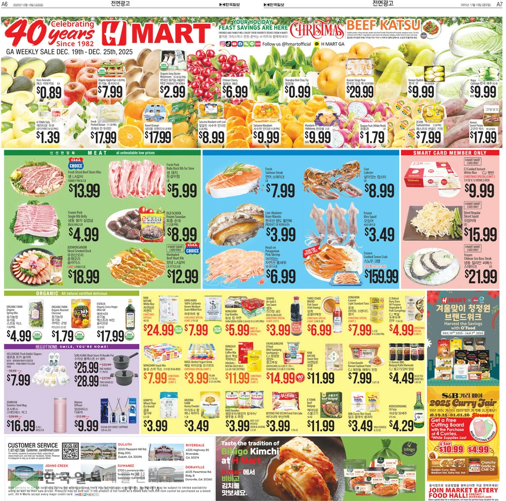 그로서리 코너에서는 자연담은 자연미 40LB EA 24.99, 하루하루마이 15LB EA 7.99, 자연담은 찹쌀 15LB EA 11.99, 농심 신라면 소컵6CUP EA 5.99, 곰표 밀가루5.5LB(2.5KG) EA 3.99, 청정원 찰고추장+쌈장 (Hmart 40주년 기획) 500g EA 14.99, CJ 해찬들 재래식 된장(기획상품) 5.07LB EA 7.99, 샘표진간장 금S 60.3OZ(1.8L) EA 3.99,청정원 소불고기양념 1.85LB(840G)EA 4.49, 삼계소스 24FLOZ EA 6.99에 판매된다.
