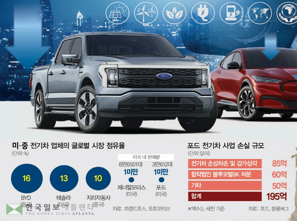 포드는 이미 전기차 부문에 투자한 비용 195억달러(세전 기준)는 연말까지 전액 손실 처리하기로 했다. 여기에는 한국의 SK온과 지분 5대5로 합작해 세운 법인 블루오벌SK의 청산 비용(60억달러)도 포함된다. SK온은 블루오벌SK의 미국 테네시 공장을 단독 운영한다는 계획이다. 짐 팔리 포드 최고경영자(CEO)는 블룸버그TV와의 인터뷰에서 “수익이 나지 않는 대형 전기차에 수십억달러를 쏟아붓는 것은 말이 안 된다”며 “우리는 (전기차 축소라는) 선택을 해야 했다”고 말했다.
