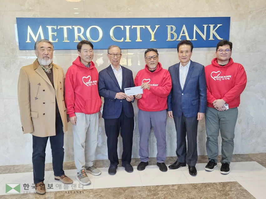 메트로시티은행(회장 백낙영, 행장 김화생)은 연말을 맞아 22일 지역 봉사단체인 미션아가페(대표 제임스 송)에 성금 5,000달러를 전달했다. 백낙영 이사장은 "꾸준하게 봉사하는