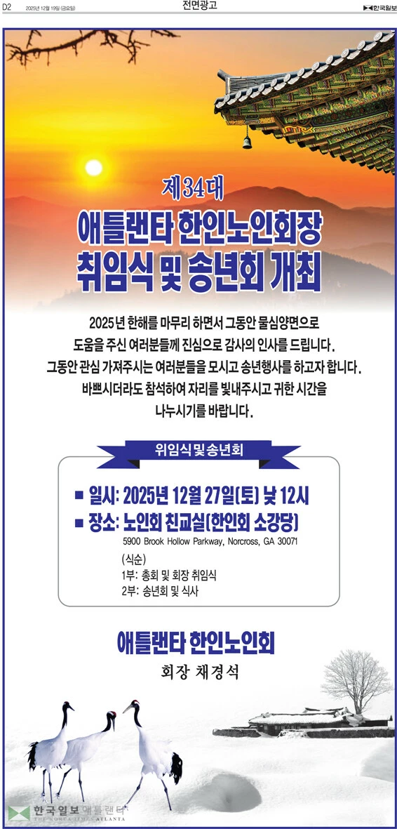 애틀랜타 한인노인회 채경석 제34대 회장 추임식 및 노인회 송년회가 12월 27일 낮 12시 한인회관 소강당에서 열린다. 문의=404-556-8377.