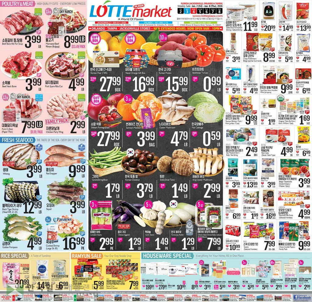 정육 코너에서는 소등갈비 찜 탕용 LB 3.99, 양념소등심 불고기 LB 8.99/PK 13.49, 소목뼈 LB 3.99, 돼지찜갈비 LB 4.99, 대패돼지목살 LB/7.99/PK9.59, 자른닭날개 패밀리팩 LB 2.99에 선보인다.