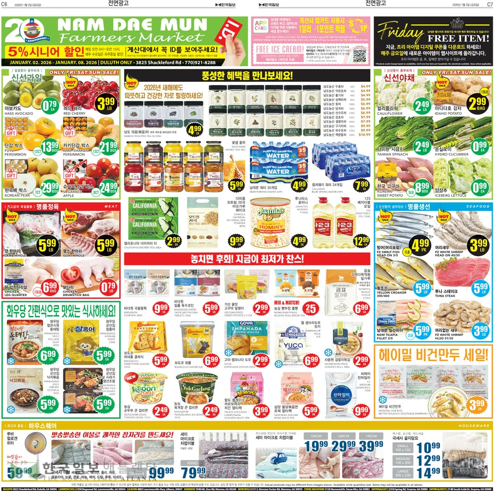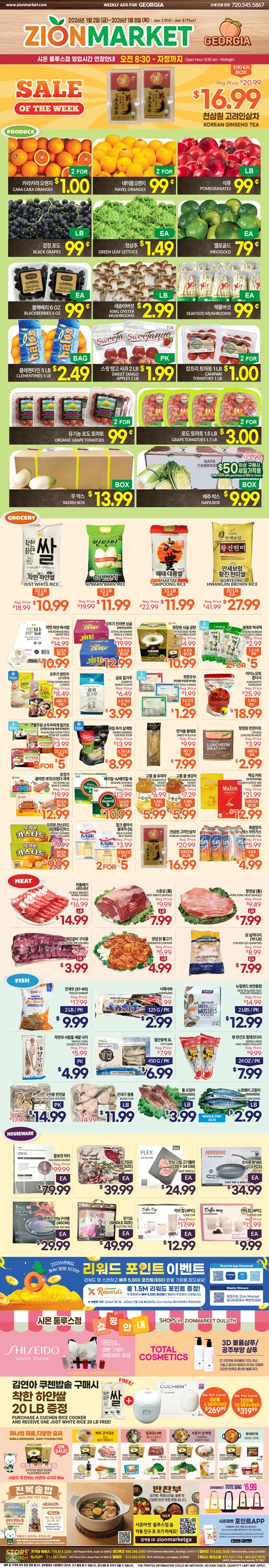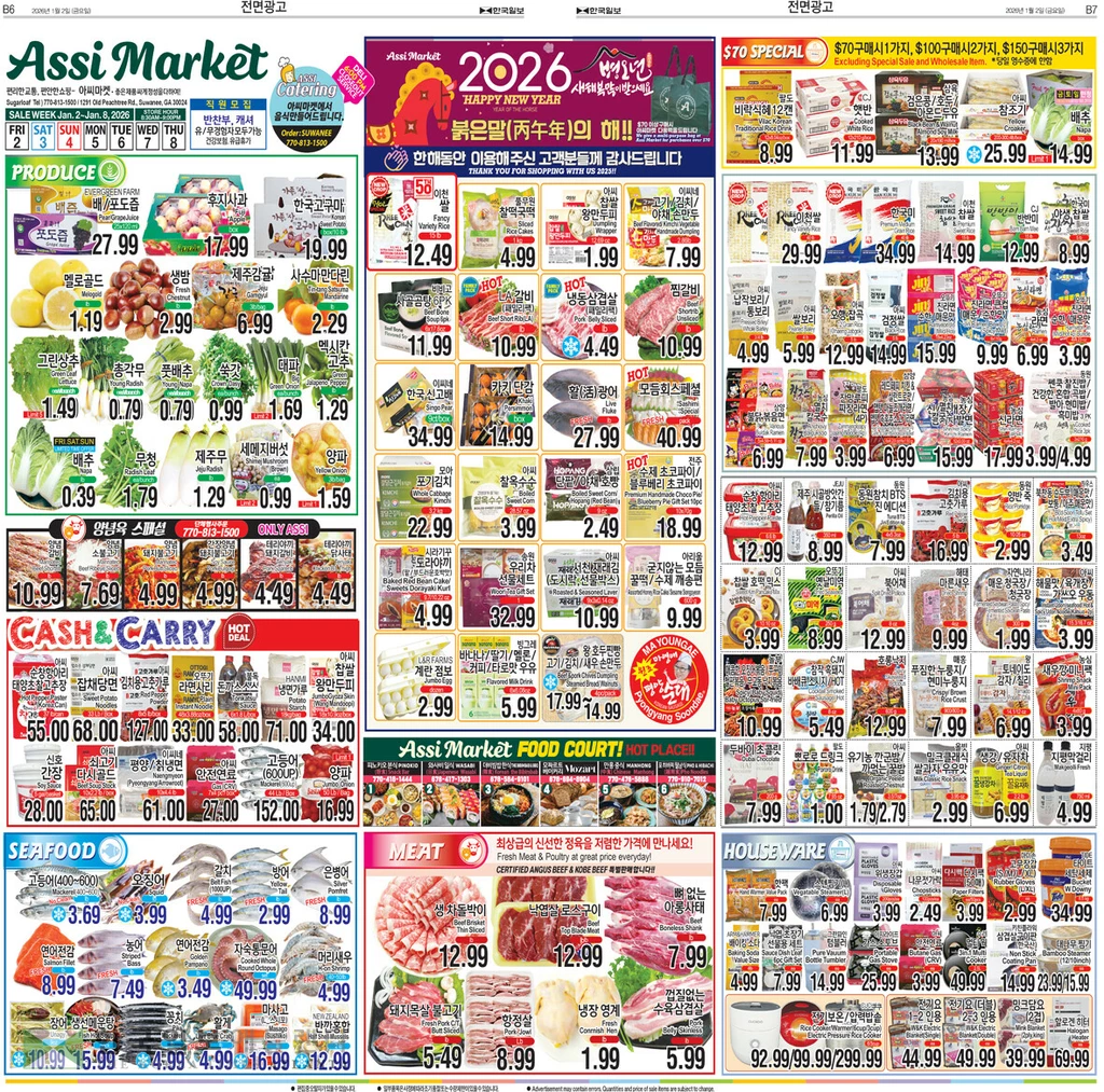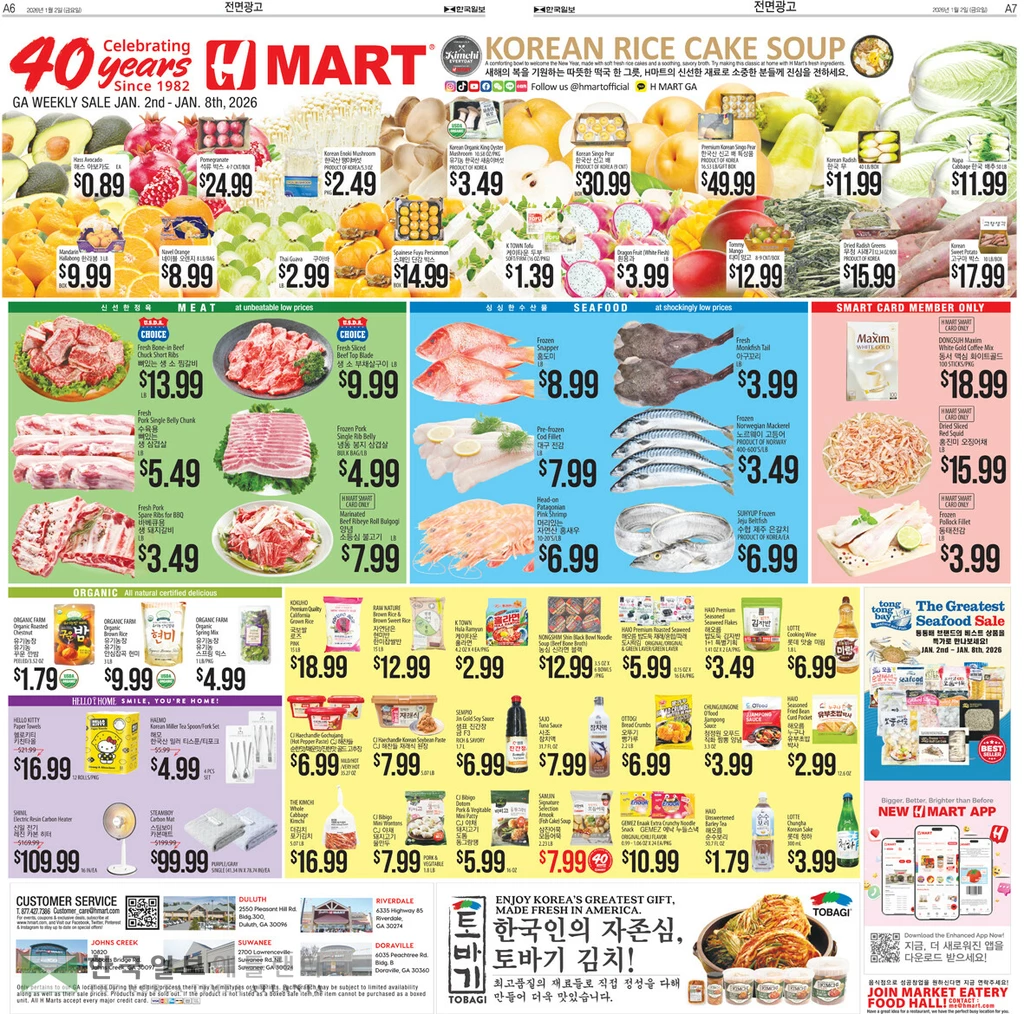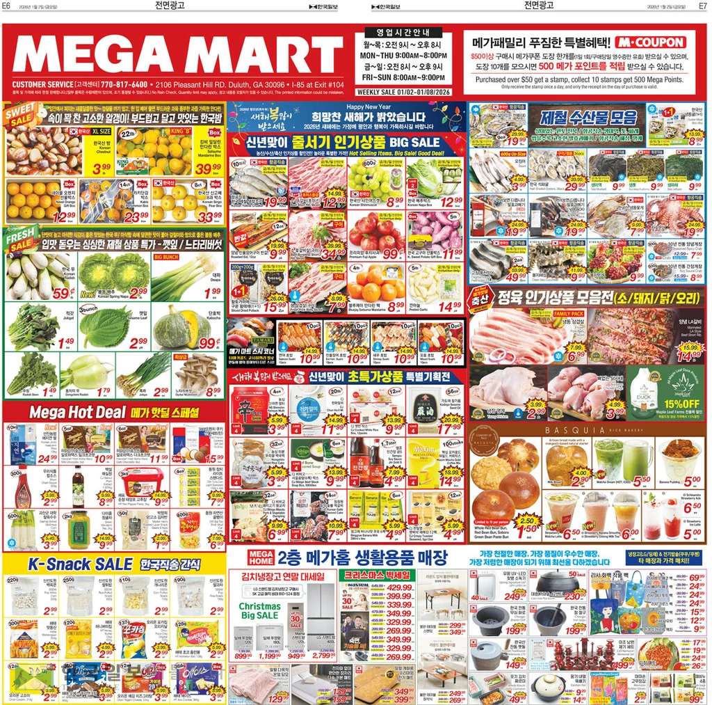 신년맞이 초특가 상품 특별기획전으로 농심 신라면 멀티팩 3.99,20 lb CJ 천하일미 11.99,CJ 햇반 박스 9.99,가도야 참기름 17.99,농심미분 우리쌀 떡국 떡 3.99,CJ비비고 사골 곰탕 박스 11.99,샘표 진간장 금 S 4.99맥심 모카골드마일드 커피믹스 박스 14.99,CJ 비비고 돼지고기 왕교자 ea 6.99,청정원 참작 숯불 떡갈비7.99,빙그레 바나나맛 우유 6팩 4.99,CJ 천일염 햇바삭 재래김 12팩 4.99가 선보인다.