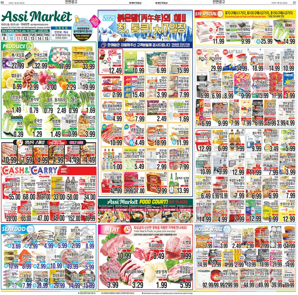 신년 양념육 스페셜로는 양념 갈비 파운드 10.99, 양념 소불고기 파운드 7.69, 양념 돼지불고기 파운드 4.99, 간장양념 돼지불고기 파운드 4.99, 테리야끼 닭사태 파운드 4.49, 테리야끼 돼지갈비 파운드 4.49달러에 선보인다.
