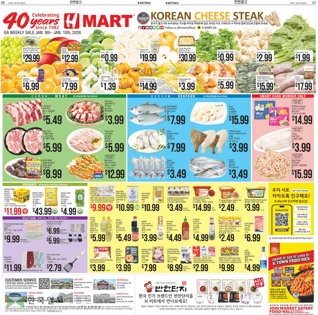 해산물 코너에서는 (금/토/일 한정) 항공직송 살아있는 전복(대) 8개 19.99, 한국산 냉동굴 2팩 9.99, 반건조 바다장어 구이포 2팩 19.99, 오징어 파운드 3.99, 오징어 순대 7.99, 진양 전복 물회 7.99, 하동 재첩국 2팩 9.99, 생미역 팩 9.99, 생톳 팩 9.99, 생파래 팩 9.99, 자숙문어 파운드 19.99, 고창 풍천장어 2마리 49.99, 봉지해삼 11.99, 봉지멍게 9.99, 한국 석화 팩 29.99달러에 선보인다.