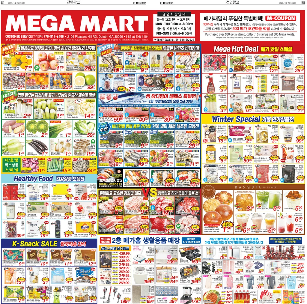 그로서리 코너에서는 하루하루마이 15파운드 10.99, 자연담은 현미 15파운드 10.99, 해찬들 진한맛 고추장 3kg 14.99, 해오름 고소한 양념 쌈장 2.2파운드 3.99, 샘표 진간장 금S 1.8L 5.49, 큐피 드레싱 참깨 8oz 3.99, 스리라차 핫 칠리 소스 28oz 4.49, CJ 백설 남해 굴소스 4.99, 오뚜기 양조식초 1.8L 5.99, CJ 백설 햇바삭 재래김 3.49, 오뚜기 3분 카레 2.49달러에 제공된다.
