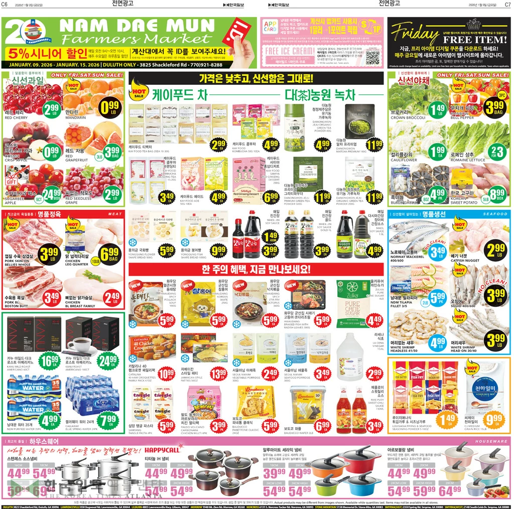 생선 코너에서는 물오징어 파운드 3.99, 노르웨이 고등어 파운드 2.99, 깐새우 2파운드 팩 9.99, 햇살애 코다리 1kg 팩 8.99, 맛쥐포 파운드 11.99, 은대구 몸통 파운드 11.99, 참조기 4파운드 박스 18.99, 시메사바 팩 2.99, 한국 민물 장어 개당 19.99, 바지락 살 파운드 4.99달러에 제공된다.