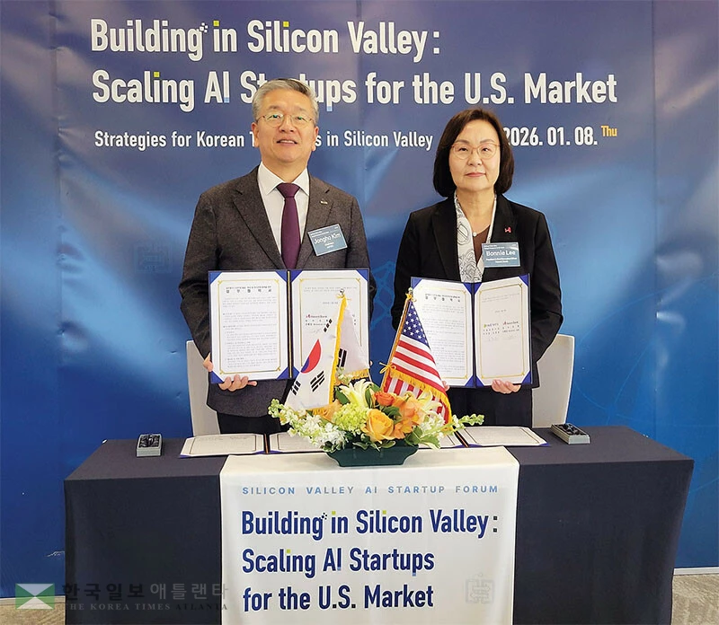 한미은행은 지난 8일 실리콘밸리에 위치한 기술보증기금(이하 기보) 실리콘밸리 지점에서 기술보증기금과 ‘북미 투자 네트워크 연계 및 협력 강화’를 위한 업무협약(MOU)을 체결했다. 기보는 한국 중소벤처기업부 산하 기관으로 스타트업과 벤처기업의 글로벌 시장 진출을 지원하고 있다. 이번 협약을 통해 기보와 한미은행은 북미 진출기업에 대한 상호 협력 및 지원을 강화한다. 바니 이 행장(오른쪽)과 기보 김종호 이사장이 MOU를 체결했다. [한미은행 제공]