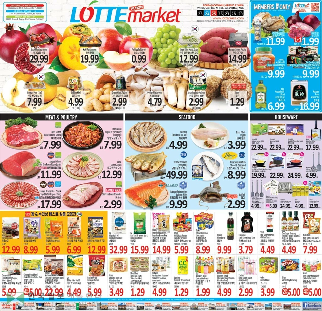 롯데 플러스 카드 소지 고객에게는 완도 자숙 전복 PK 11.99, 빨간 양파 1+1 BAG 1.99, 종가 맛김치 42.3OZ 9.99, 닥터 정스 푸드 배지밀 9.99, 아씨 아보카도유 67.6OZ 6.99, 가도야 참기름 56OZ 16.99에 제공된다.