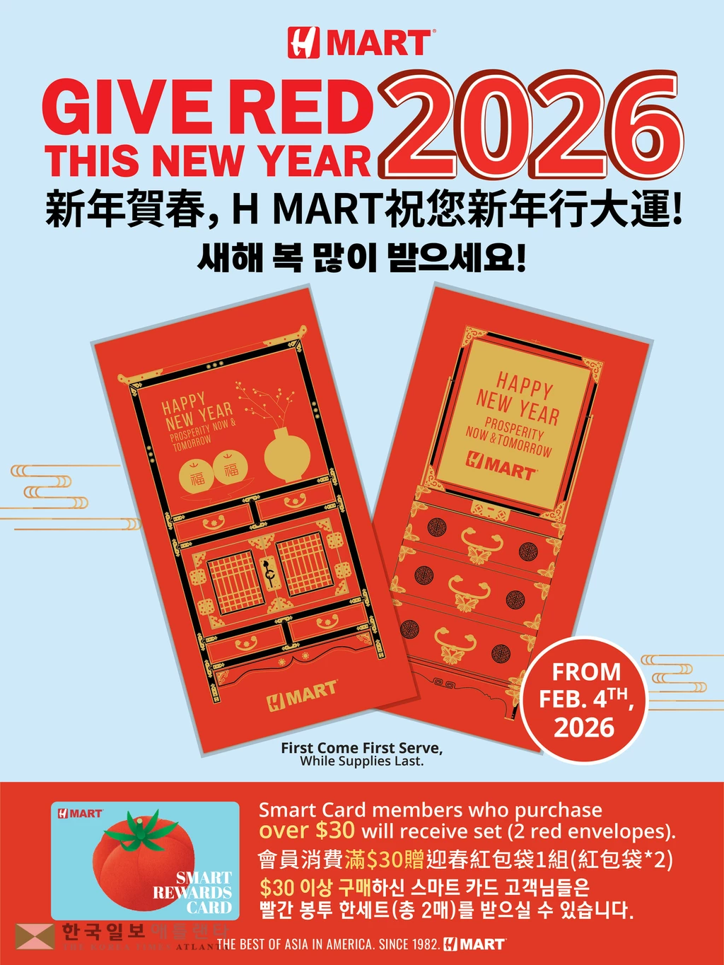 미주 최대 아시안 슈퍼마켓 체인 H 마트가 병오년 설을 맞이하여 2026년 2월 4일부터 H 마트 스마트카드 회원을 대상으로 ‘2026 설 봉투 무료 증정 이벤트’를 진행한다.