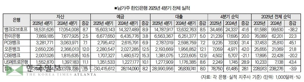 연간 순익을 은행별로 보면, 한미은행은 7,609만달러로 전년 동기 대비 22.3% 늘었고, PCB 은행도 3,745만달러로 45.1% 증가했다. 오픈뱅크는 2,566만달러(21.8%↑), US 메트로 은행은 1,023만달러(43.4%↑)로 늘었다. 반면 뱅크오브호프는 6,159만달러로 38.2% 감소했으며, CBB 은행도 1,790만달러로 20.2% 줄었다.