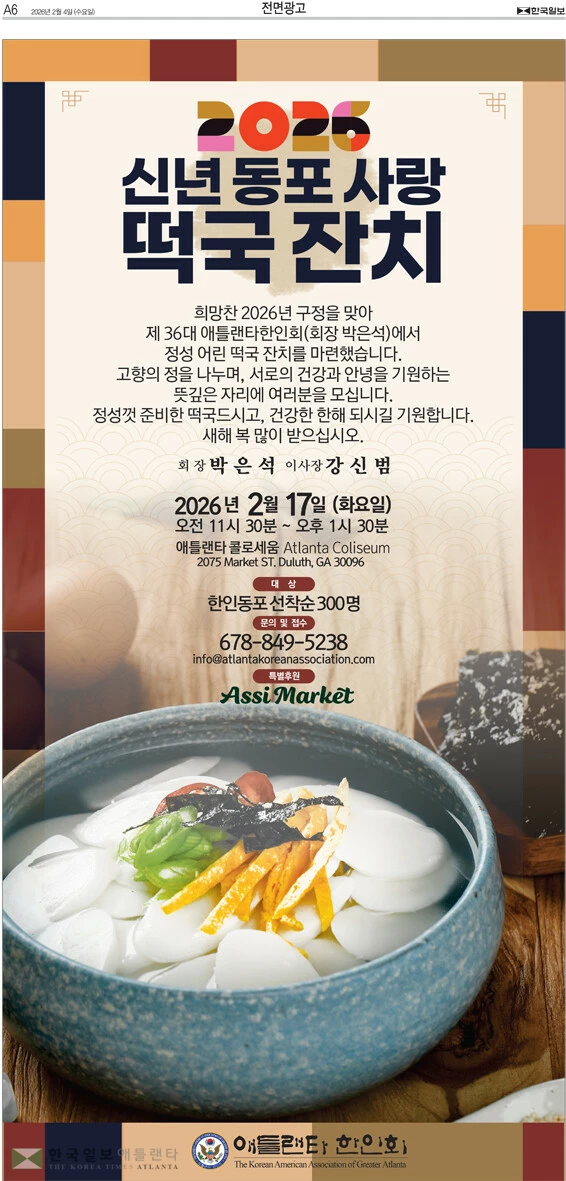 애틀랜타한인회(회장 박은석)는 설날인 17일 오전 11시 30분부터 오후 1시 30분까지 둘루스 콜로세움에서 신년 동포사랑 떡국잔치를 개최한다. 선착순 300명에 떡국을 대접한다. 문의=678-849-5238.