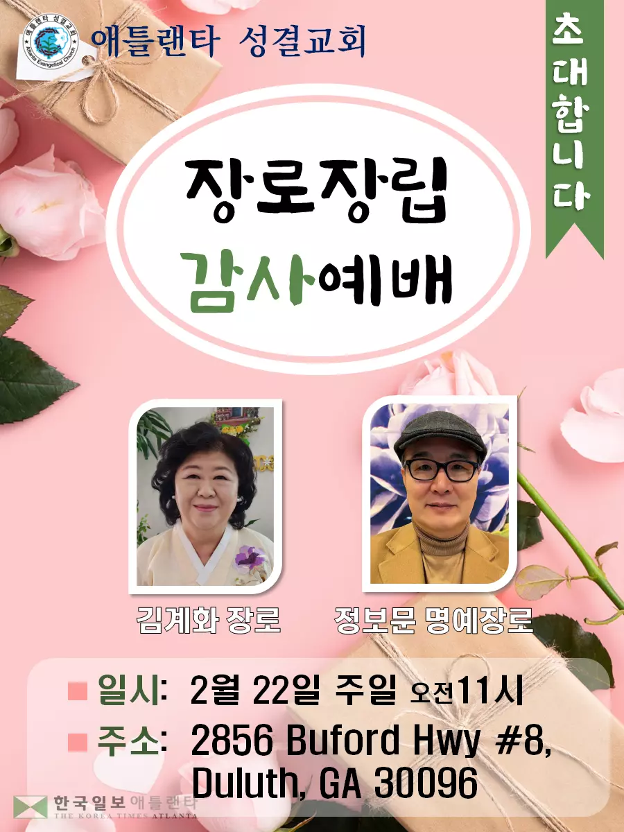 애틀랜타성결교회(담임목사 김종민)는 오는 2월 22일(일) 오전 11시, 교회 본당에서 장로장립 및 명예장로 추대 임직식을 거행한다.