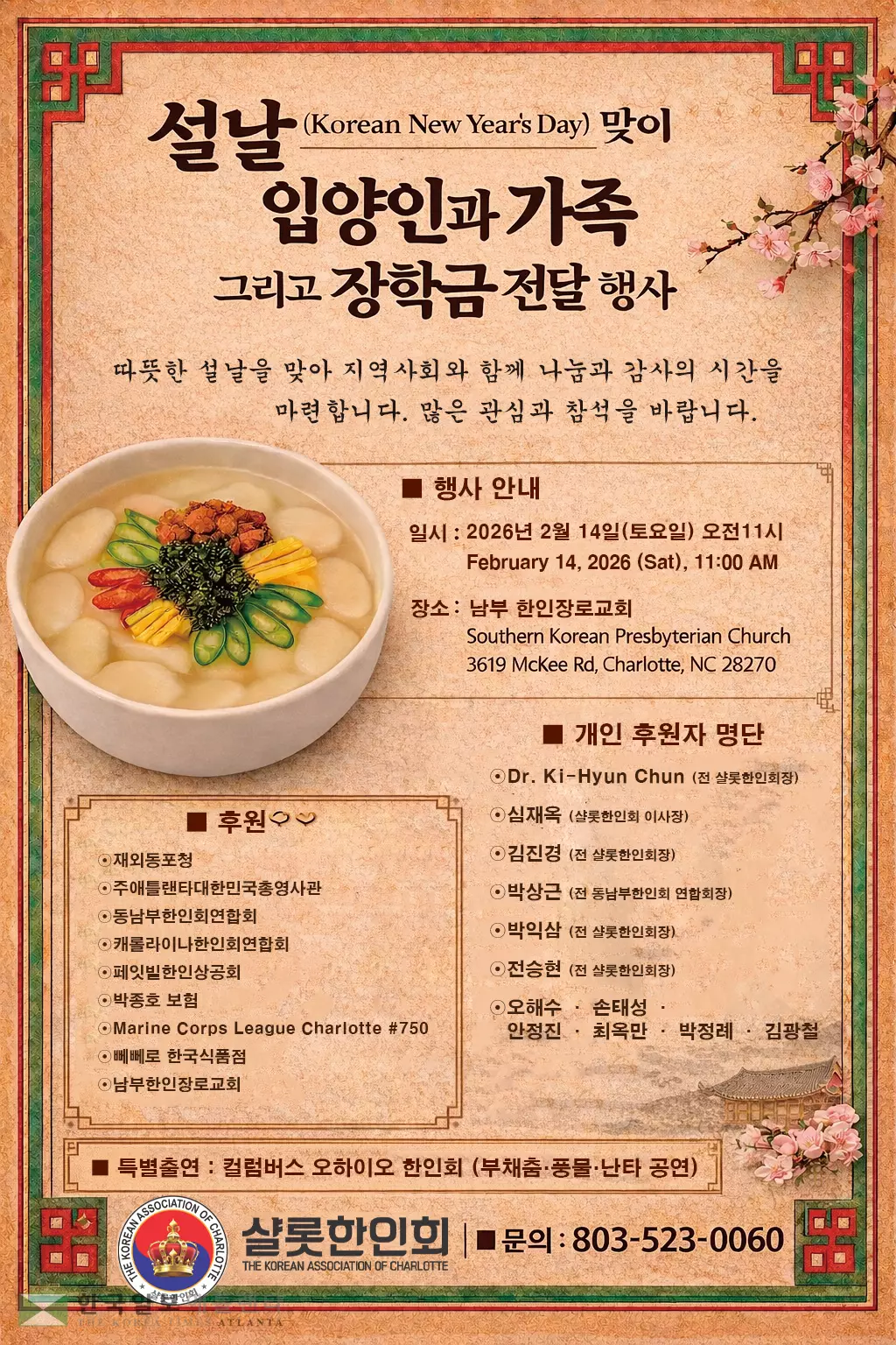 14일 오전 11시 샬롯 남부한인장로교회에서 열리는 이번 행사는 입양인과 그 가족들이 한국의 전통 명절 문화를 체험하게 하려는 의도로 기획됐으며, 차세대를 위한 장학금 전달식도 함께 마련됐다.
