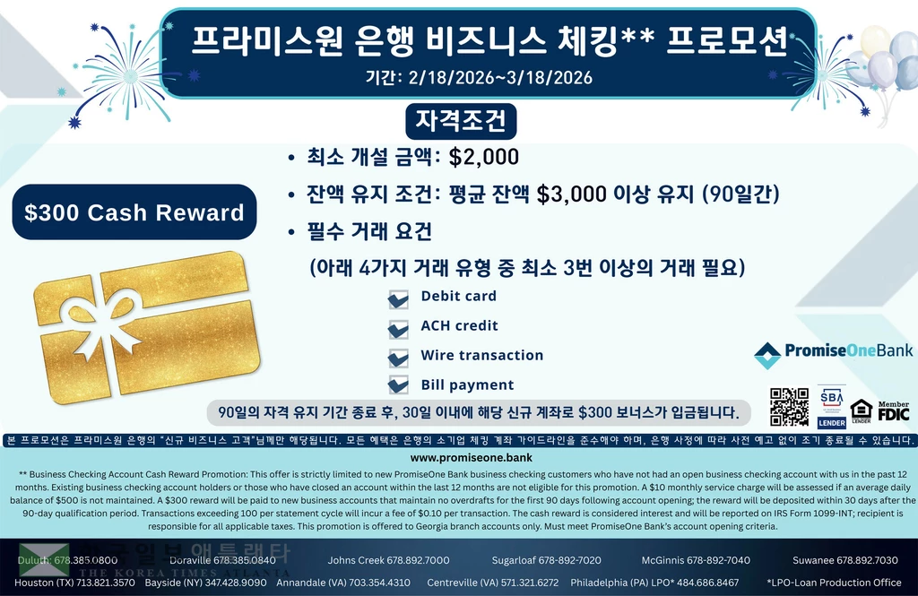 프라미스원 은행(행장 션 김)이 새해를 맞아 지역 비즈니스 활성화와 신규 고객 유치를 위한 특별 캐시 리워드 프로모션을 진행한다.