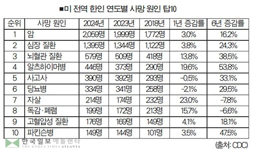 연방 질병통제예방센터(CDC)의 2024년 사망 통계 자료에 따르면, 미국 내 한인(단일 인종 기준) 최다 사망원인은 암으로 집계됐다. ‘부동의 1위’인 암 사망자는 2,059명으로 2023년 1,999명보다 60명(3.0%) 증가했다. 해당 통계는 기저 사인(Underlying Cause of Death)을 기준으로 집계된 수치다. (도표참조)