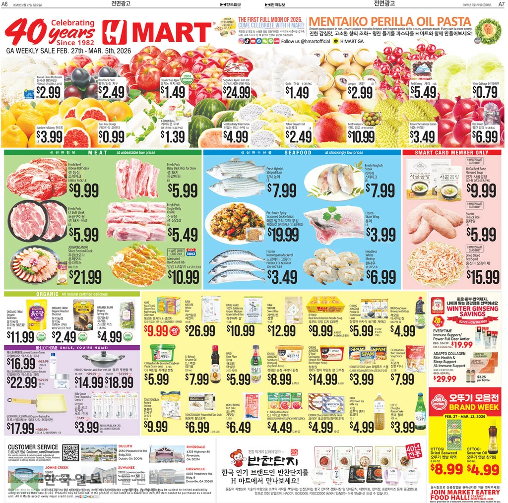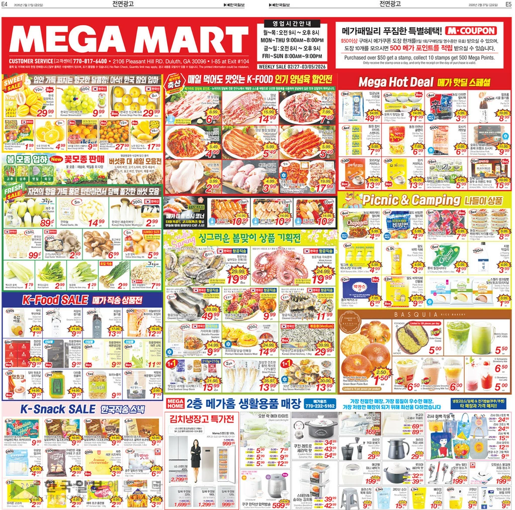 그로서리 코너에서는 자연담은 자연미 40LB EA 26.99, 하루하루마이 15LB EA 10.99,자연담은 찹쌀 15LB EA 12.99, 청정원 오푸드 리얼 김치 라면 큰컵 4.93 OZ (140G)/6 EA 9.99, 해찬들 사계절 쌈장 2.2LB(1KG) EA 5.99, 해오름 다시마간장 60.87FLOZ(1.8L) EA 4.99, 백설 고소함 가득 참기름 10.82FL OZ(320ML) EA 7.99, CJ 쇠고기 진한 다시다 1KG EA 7.99, 청정원 들기름 바사삭김 재래 도시락 16팩 4G/16PK EA 5.99, CJ 비비고 떡볶이 파우치 오리지널 12.69OZ(360G) EA 4.49, 크라운 초코하임 10OZ(284G) EA 4.99,기린 오후의 홍차 밀크티 1.5L EA 4.99에 제공된다.