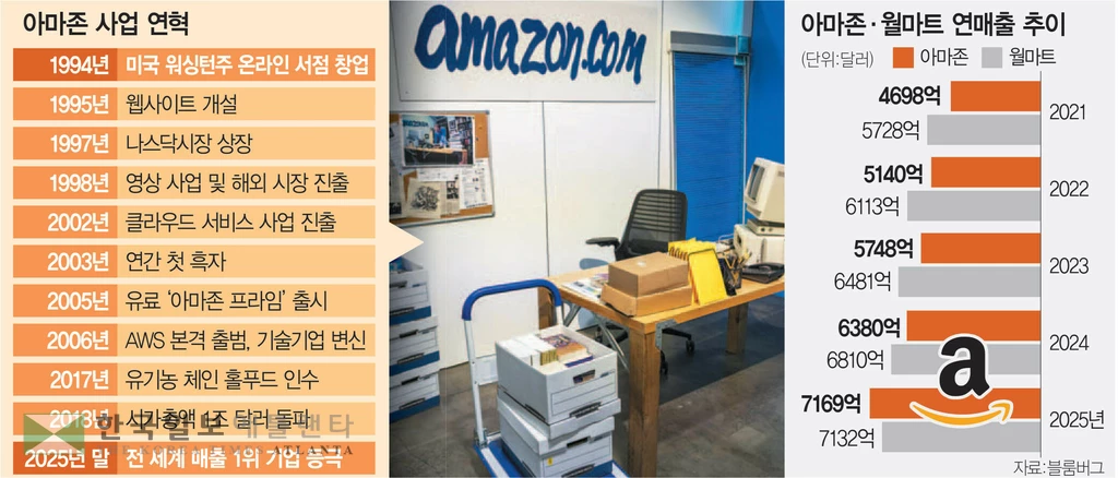 글로벌 최대 전자상거래 회사인 아마존이 월마트를 제치고 창사 32년 만에 전 세계 매출 1위 기업이 됐다. 온라인 서적 유통으로 시작했지만 이제는 인공지능(AI) 공룡으로 변신하며 시대별 혁신 키워드를 꾸준히 좇은 성과가 빛을 본 것으로 분석된다.