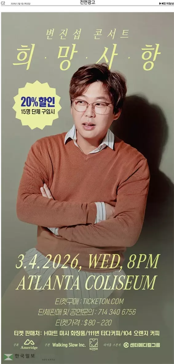 한편, 변진섭은 이번 공연을 위해 별도의 무리한 일정 없이 충분한 휴식과 사운드 체크에만 집중하며 최상의 무대를 준비하고 있다. 8090 세대의 짙은 향수를 자극할 그의 목소리가 오늘 밤 애틀랜타를 어떻게 물들일지 기대가 모아진다. 제인김 기자