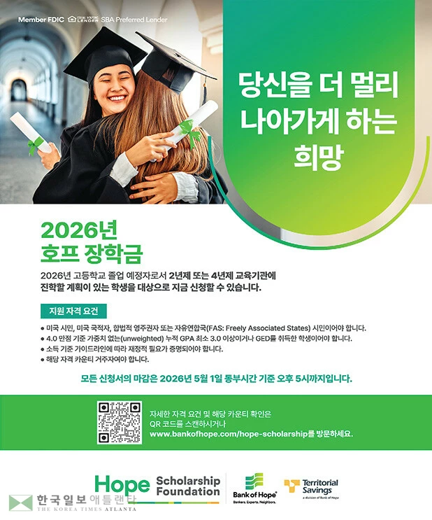 미주 최대 한인은행인 뱅크오브호프(행장 케빈 김)의 ‘호프 장학재단’이 2026년 ‘호프 장학금’ 신청자를 모집한다.
