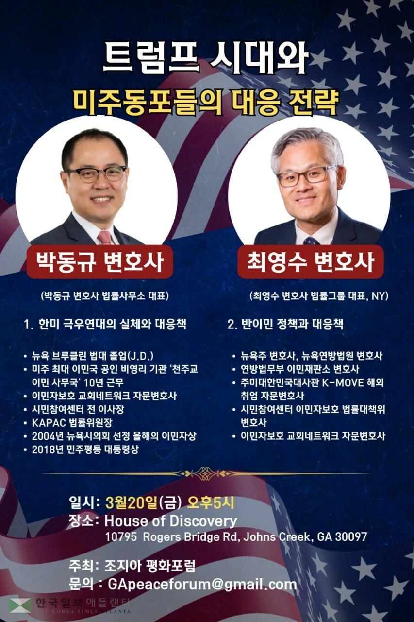 조지아 평화포럼은 "트럼프 2기 시대가 한인 사회에 가져온 변화는 단순한 정책 변화가 아니라 공동체 전체의 생존과 존엄이 걸린 문제"라며 "정확한 정보와 실천 가능한 대응 전략을 공유해 동포 사회가 보다 안전할 수 있기를 바란다"고 밝혔다.