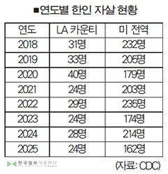 CDC 통계에 따르면 LA 카운티 한인 자살은 2018년 31명, 2019년 33명 등을 기록하다가 펜데믹이 시작된 2020년 40명으로 크게 증가했다. 이후 2021년 24명, 2022년 29명, 2023년 24명, 2024년 28명 등, 20명에서 30명 사이에서 등락을 반복하고 있다.