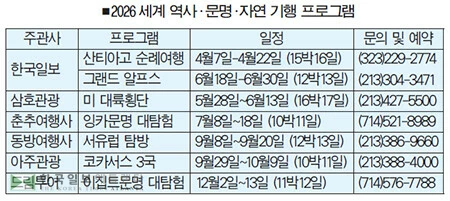 이들 여행 상품은 1등 언론사 한국일보의 신뢰도와 5대 여행사들의 축적된 경험과 노하우를 토대로 실시되는, 평소 꿈꾸던 인생 여행 코스를 망설임 없이 신청할 수 있는 프로그램들이다. 2026 세계 역사·문명·자연 기행 시리즈는 한인들의 뜨거운 관심과 참여 속에 한인사회 여행 문화를 한 차원 더 도약시키며 새로운 협력의 모델을 제시하게 될 것이다.