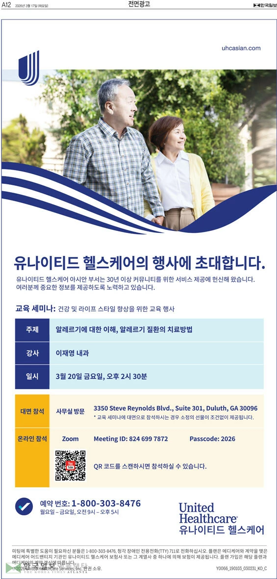 유나이티드 헬스케어는 3월 20일 금요일 오후 2시 30분 둘루스 사무실(3350 Steve Reynolds Blvd, Suite 301)에서 이재영 내과 전문의를 모시고 알레르기에 대한 이해, 알레르기 질환의 치료방법에 대한 교육세미나를 실시한다. 줌으로도 참여할 수 있다. 예약은 1-800-303-8476.
