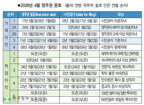 연방 국무부가 17일 발표한 2026년 4월 중 영주권 문호에 따르면 석사 이상 고학력자들을 대상으로 하는 취업 2순위 부문은 영주권 판정 우선일자가 없어지고 오픈(open) 상태로 개선됐다.