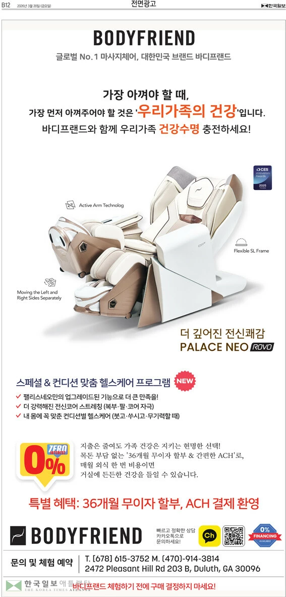 금로벌 No.1 마사지체어, 대한민국 브랜드 바디프렌드는 '더 깊어진 전신쾌감 페리스네오'를 36개월 무이자 할부로 판매한며, ACH 결제를 환영한다. 문의 및 체험예약=678-615-3752, 470-914-3814.