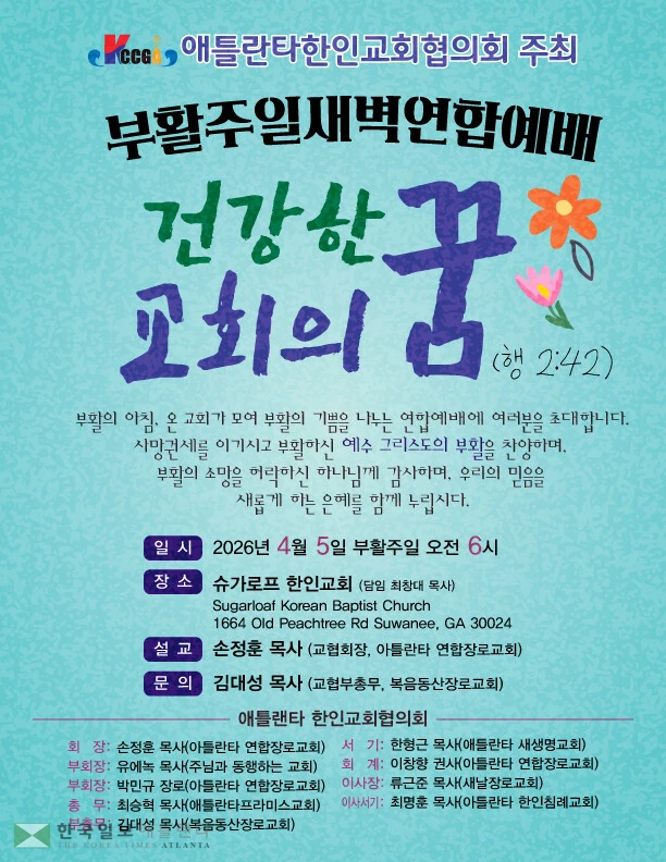 애틀랜타 한인교회협의회(회장 손정훈 목사)는 2026년 부활주일 새벽 연합예배를 4월 5일 오전 6시 스와니 슈가로프한인교회(담임목사 최창대)에서 개최한다.