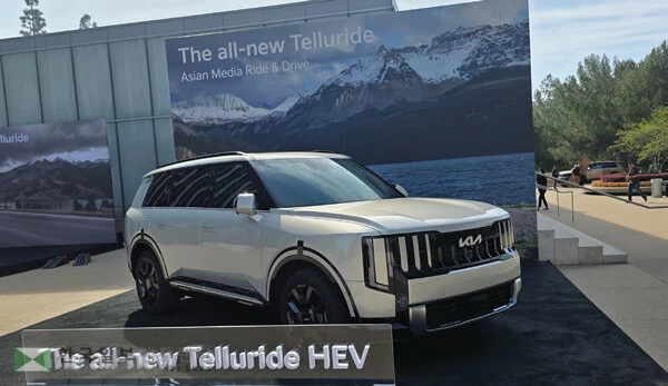 기아가 26일 LA 센추리시티에서 2027년형 기아 텔루라이드 하이브리드와 X-Pro 모델 공개행사를 개최했다. 기아는 2027년 모델부터 플래그십 SUV 모델인 텔루라이드에 최초로 하이브리드 파워트레인을 선택사양으로 제공하며 돌풍을 예고했다. 오프로드 성능이 강화된 X-Pro 모델도 선보였다. 하이브리드 모델은 복합연비 갤런당 35마일의 높은 연비 효율성을 자랑한다. 이날 행사장에텔루라이드 하이브리드 차량이 전시돼 있다.