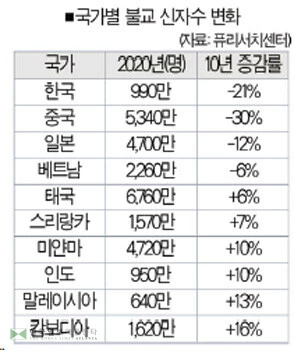 전 세계 불교 신자의 대부분은 아시아에 거주하고 있으며, 전체의 90% 이상이 한국을 포함, 태국, 중국, 미얀마, 일본 등 10개 국가에 집중돼 있다. 그런데 이들 국가 불교 가정에서 성장했지만 더 이상 자신을 불교 신자로 여기지 않는 사람들이 늘고 있는 것이다.