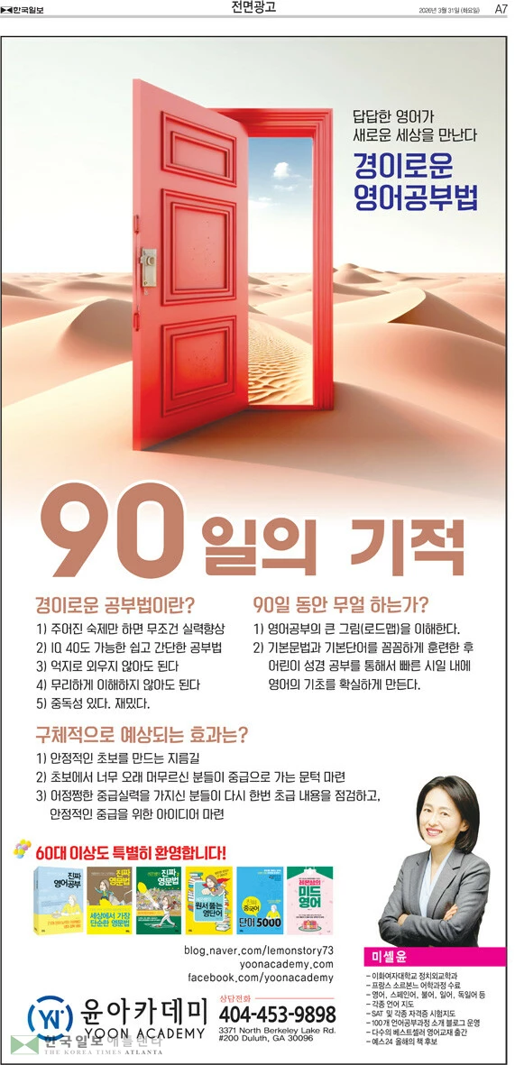 경이로운 영어공부법으로 답답한 영어가 새로운 세상을 만난다. 숙제만 해도 실력이 향상되고, 안정적인 영어 보가 된다. 60대 이상도 등록 환영한다. 문의=404-453-9898.