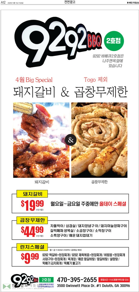 4월 빅 스페셜로 돼지갈비 1인분 19.99달러 월-금 주중 올데이 스페셜, 곱창 1인분 44.99달러 무제한, 런치스페셜 월-금 9.99달러에 세일한다.