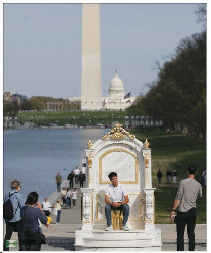 수도 워싱턴 DC에 도널드 트럼프 대통령의 허영심을 풍자하는 ‘황금변기’가 등장했다. 워싱턴포스트(WP) 등에 따르면 관광객들이 많이 찾는 내셔널몰에 황금색으로 칠한 변기 모양의 조형물이 설치됐다. 대리석처럼 보이는 자재로 만든 왕좌에 의자 대신 변기를 올린 이 조형물에는 “왕에 어울리는 왕좌”라고 적은 팻말이 붙었다. 지난달 30일 한 남성이 황금색 변기에 앉아 포즈를 취하고 있다. [로이터]