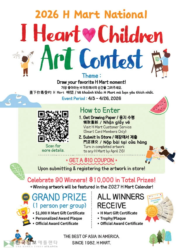 대회는 오는 4월 3일(금)부터 4월 26일(일)까지 진행되며, H 마트 스마트 리워드 카드 회원 자녀 중 Pre-K부터 5학년까지 참여할 수 있다.