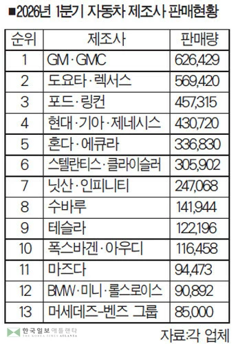 최근 주요 완성차 업체들이 공개한 2026년 1분기 미국 시장 판매 실적에 따르면 GM은 62만6,429대를 판매하며 1위를 굳건히 지켰다. 2위는 도요타·렉서스(56만9,420대), 3위는 포드·링컨(457,315대)으로, 상위 3강 구도에는 큰 변화가 없었다. 현대차·기아·제네시스로 구성된 현대차그룹은 43만720대를 판매하며 4위를 유지, 북미 시장 내 입지를 한층 더 강화했다.
