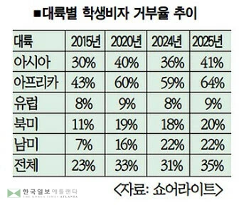 반면 남미 지역은 다른 흐름을 보였다. 남미 학생들의 비자 거부율은 2022년 31%에서 2025년 22%로 감소하며 최근 4년간 완만한 하락세를 기록했다. 다만 여전히 10년 전과 비교하면 높은 수준을 유지하고 있어 완전한 개선으로 보기는 어렵다는 평가다.
