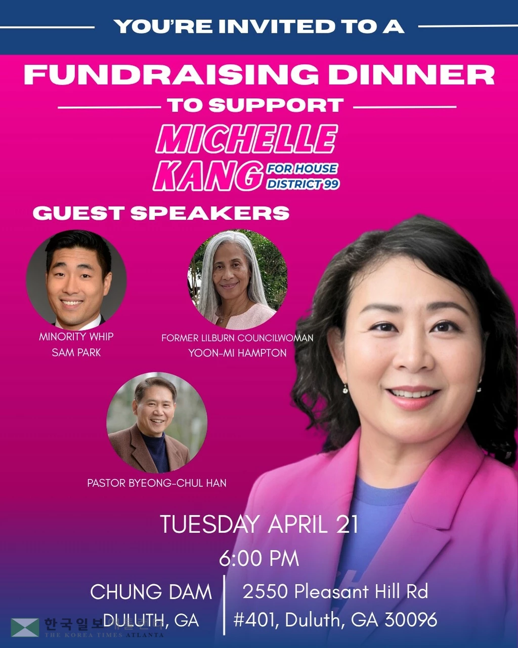 조지아주 하원99지역구에 출마한 미쉘 강 후보가 오는 4월 21일(화) 오후 6시, 둘루스 소재 청담에서 선거 승리를 위한 후원회를 개최한다.